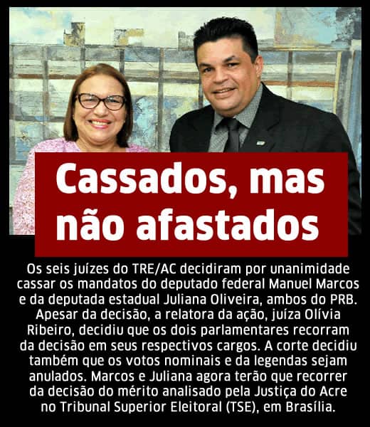 Os seis juízes do Tribunal Regional Eleitoral do Acre (TRE/AC), decidiram por unanimidade cassar os mandatos do deputado federal Manuel Marcos e da deputada estadual Juliana Oliveira, ambos do PRB. O julgamento iniciou na manhã desta segunda-feira, 10, e durou mais de 10 horas, se estendendo até o início da tarde com sustentação oral de advogados de defesas, dos procuradores do Ministério Público Eleitoral e dos votos dos julgadores.