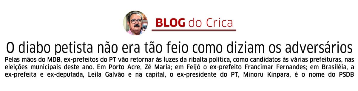 Pelas mãos do MDB, ex-prefeitos do PT vão retornar às luzes da ribalta política, como candidatos às várias prefeituras, nas eleições municipais deste ano. Em Porto Acre, o MDB foi pinçar um petista radical para disputar a prefeitura pela sigla, o ex-prefeito Zé Maria. Outro antigo petista será candidato a prefeito de Feijó pelos emedebistas, o ex-prefeito Francimar Fernandes. Em Brasiléia, o MDB vai para o palanque disputar a prefeitura com a ex-prefeita e ex-deputada do PT, Leila Galvão. Na capital, o ex-presidente do PT, Minoru Kinpara, é o nome do PSDB para tentar ganhar a prefeitura. O PT também estará no palanque do MDB, apoiando a reeleição do prefeito Mazinho Serafim (MDB), em Sena Madureira. Qual a conclusão a se chegar disso tudo? É que o diabo petista, não era tão feio como pregavam os adversários.