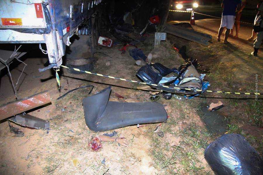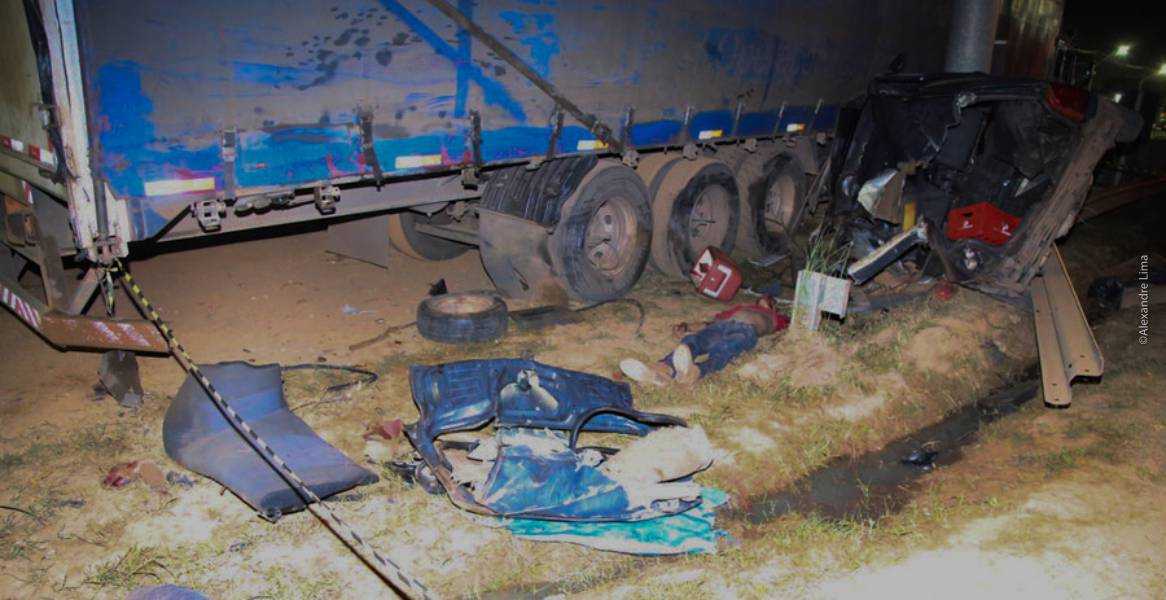O veículo saiu da BR sentido, rodou, capotou e pode ter batido em um ferro onde arrancou o teto, para em seguida bater na parte traseira da carreta estacionada, parando entre o poste e o caminhão.
