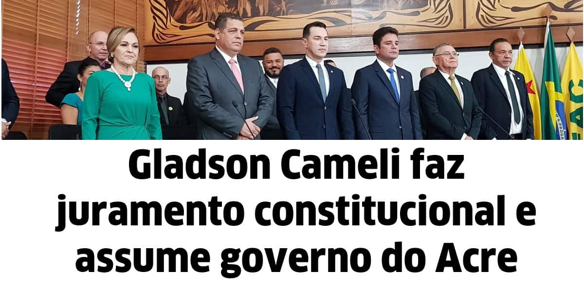 O progressista Gladson de Lima Cameli e o tucano Wherles Rocha, fizeram há pouco a leitura do juramento constitucional, e foram empossados pelo presidente da Assembléia Legislativa do Acre, Ney Amorim (sem partido), nos cargos de governador e e vice-governador do estado do Acre para o quadriênio 2019-3022.