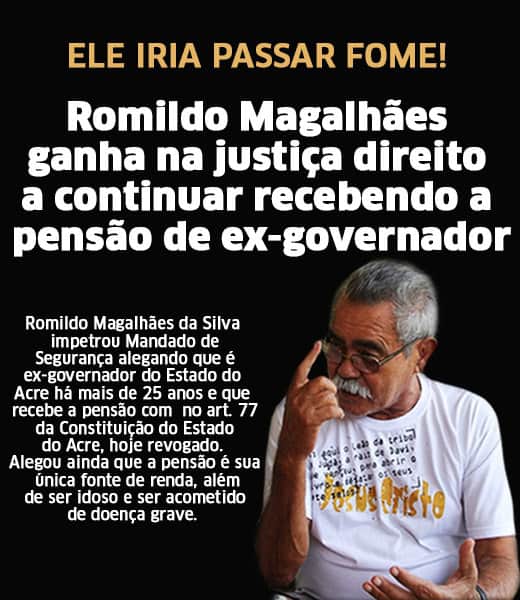 Romildo Magalhães da Silva impetrou Mandado de Segurança alegando que é ex-governador do Estado do Acre há mais de 25 anos e que recebe a pensão com no art. 77 da Constituição do Estado do Acre, hoje revogado. Alegou ainda que a pensão é sua única fonte de renda, além de ser idoso e ser acometido de doença grave.