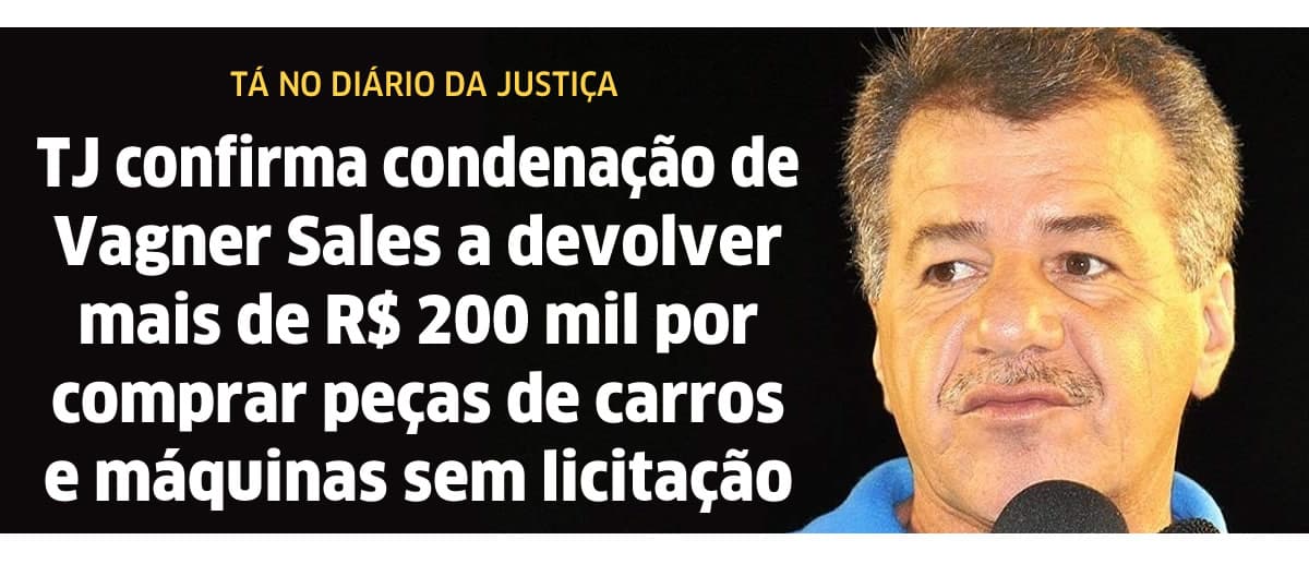 Justiça confirma condenação de Vagner Sales a devolver mais de R$ 200 mil por comprar peças de carros e máquinas sem licitação