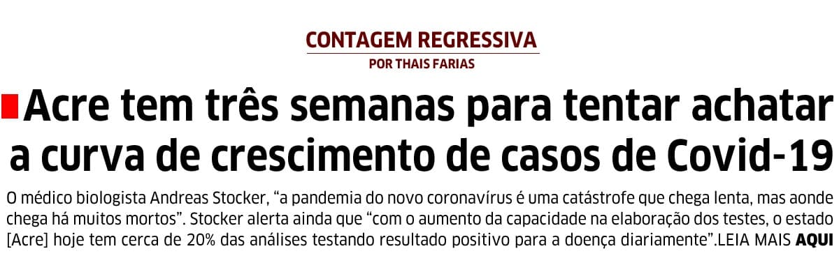 O número de infectados no Acre é muito maior do que o número oficial. Segundo o médico, a tendência é que o estado tenha pelo menos cerca de 2,5 mil pessoas que estão infectados e quem nem sabem que estão com o vírus. “Por isso é importante que fiquem em casa, evitem contato com outras pessoas e não façam visitas. Não temos outra escolha, essa é a única chance”, conclui o médico.