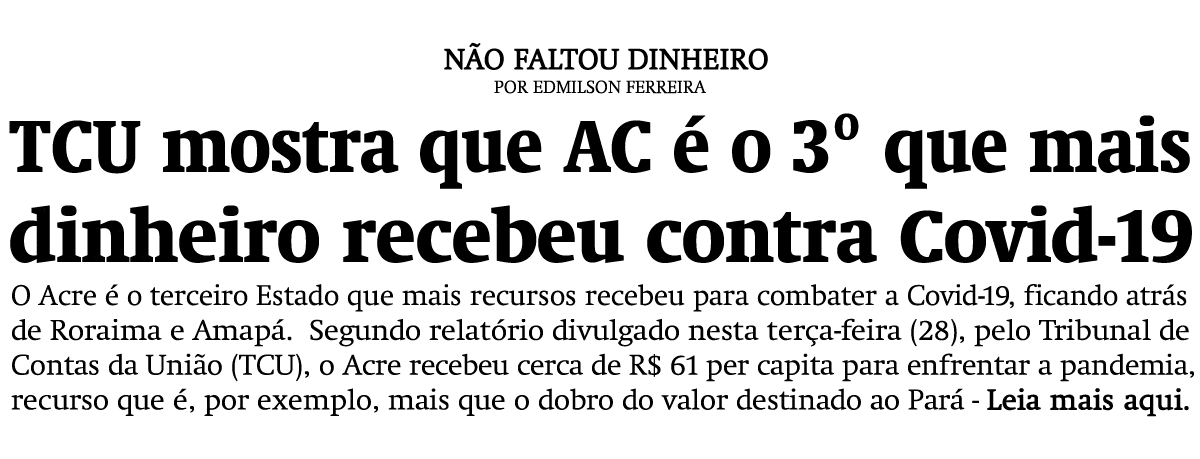 O Acre é o 3º Estado que mais recursos recebeu para combater a Covid-19, ficando atrás de Roraima e Amapá. Segundo relatório divulgado nesta terça-feira (28), pelo Tribunal de Contas da União (TCU), o Acre recebeu cerca de R$ 61 per capita para enfrentar a pandemia, recurso que é, por exemplo, mais que o dobro do valor destinado ao Pará (R$ 27).
