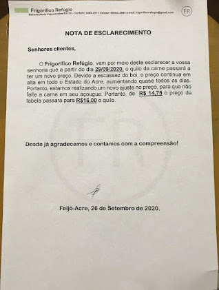 O frigorifico refugio, vem por deste esclarecer a vossa senhoria que a partir de terça-feira, 29/09/20, o quilo da carne passará a ter um novo preço. Devido a escassez do boi, o preço continua em alta em todo o estado do Acre, aumentando quase todos os dias. Portanto, estamos realizando um novo ajuste no preço, para que não falte carne em seu açougue. Portanto, de R$ 14,75 o preço da tabela passará para R$ 16.00 o quilo.